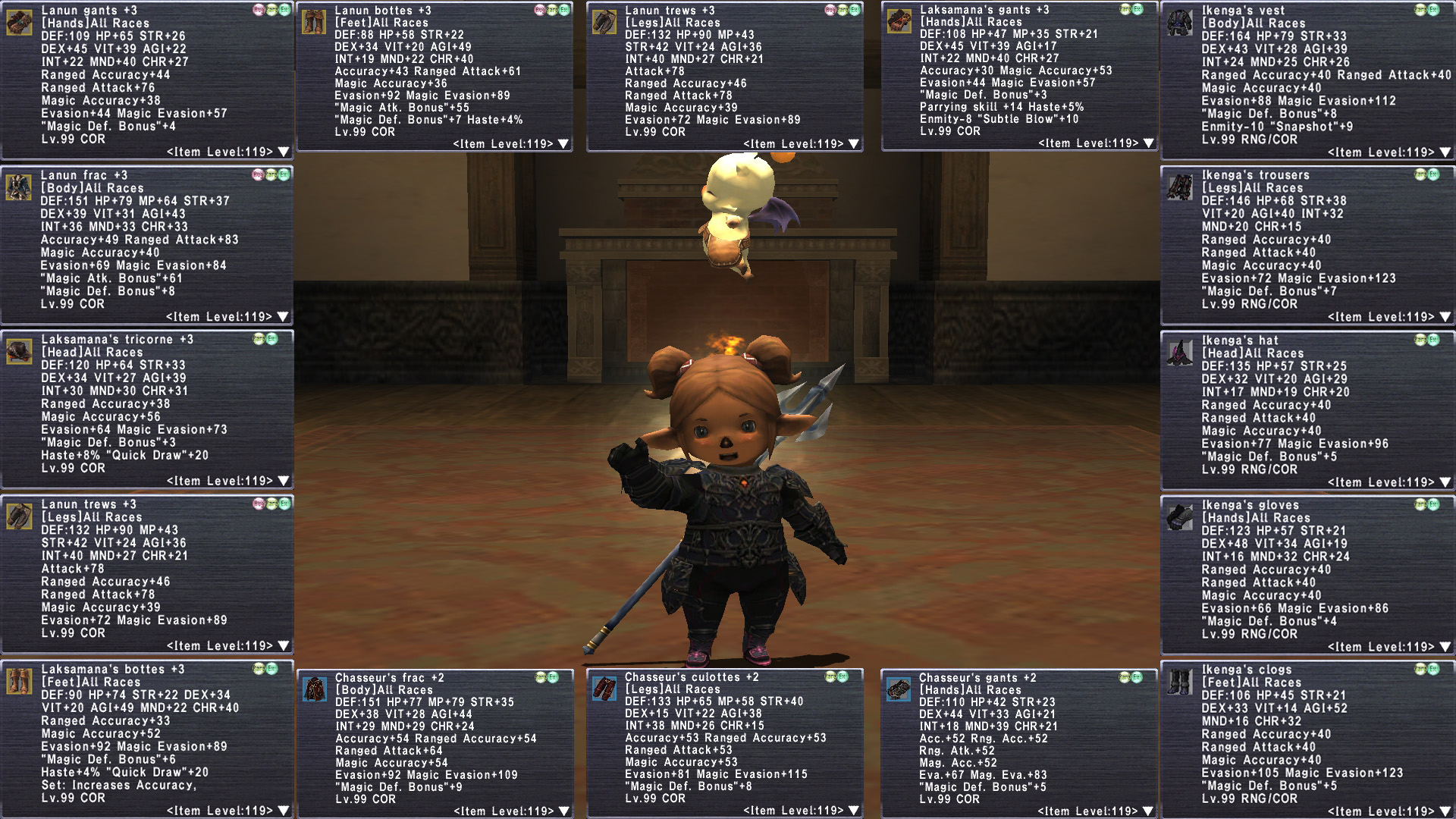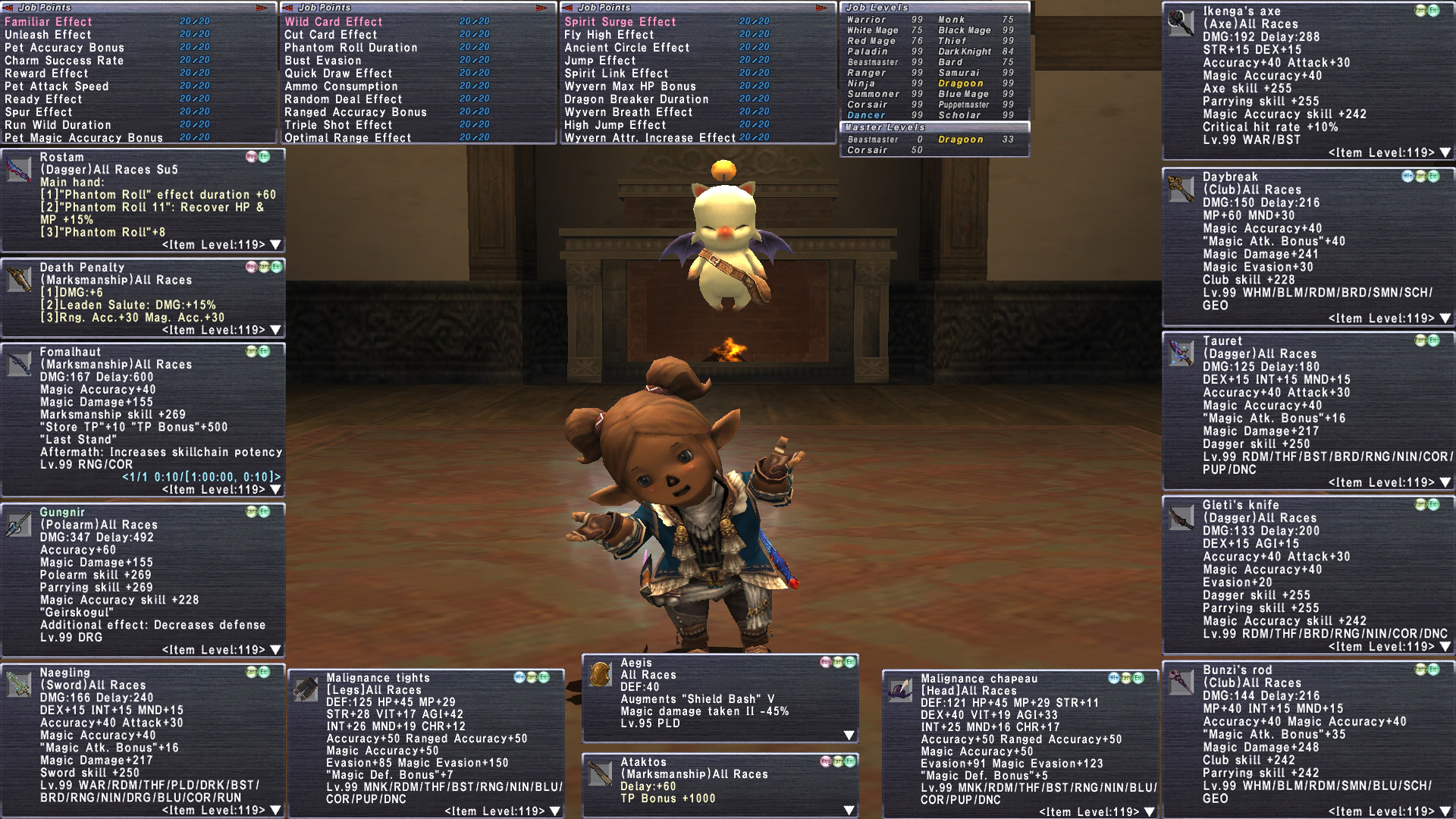 tldr Nice Taru Female with a very well built Corsair. Death Penality, Fomal, Savage setup with TP Bonus gun, Desultor Tassets, 6x Malignance, Rostam su5+2 neck, Decetn DRG as well. Unity r15. Some BST and PLD gear as well. 98 Trusts, 89k Mog Segment