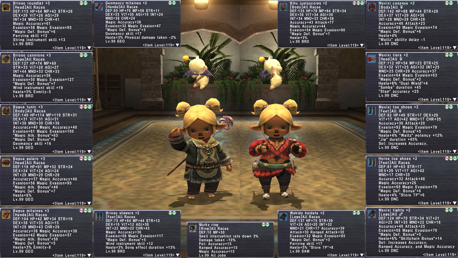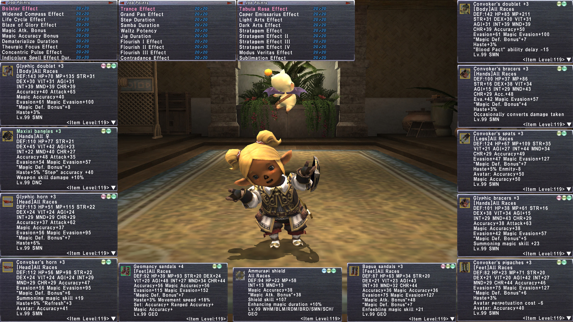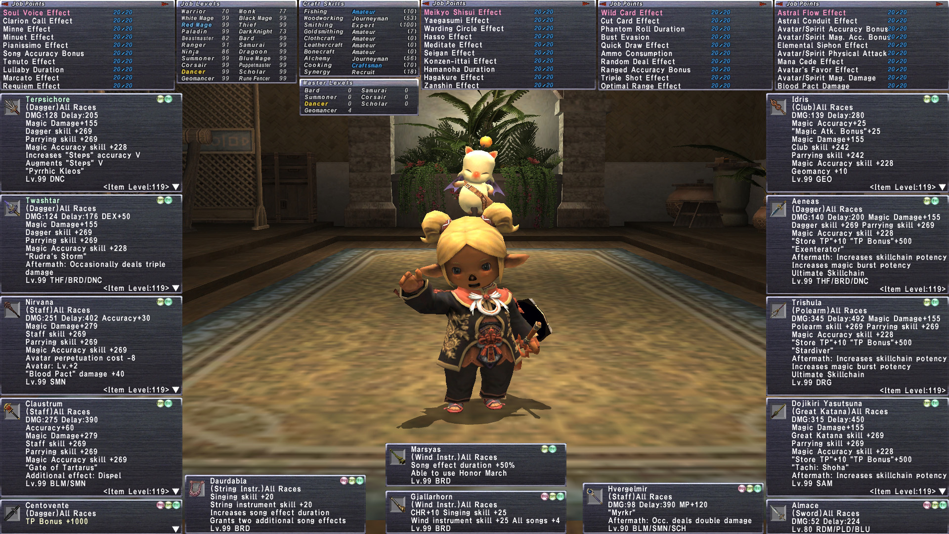 tldr Taru Female with 17x99s on one of the locked servers(Bahamut). REA Bard. Idris Geo. Nirvana Summoner. Claustrum BLM. Doji SAM, Twashtar/Terpsichore DNC. Well built has a couple Limbus pieces. Reforged +2/+3 RoV done. Good Omen and Ambu R/EX. Augmented Merinic. TP Bonus dagger, Dring, Fotia Belt/Gorget/Fucho no obi, 100 smithing, 114k Tokens. Coud use some Odyssey and Sortie, great funamentals not a burned/premade account. Great addition to any army with the REMA selection and jobs
