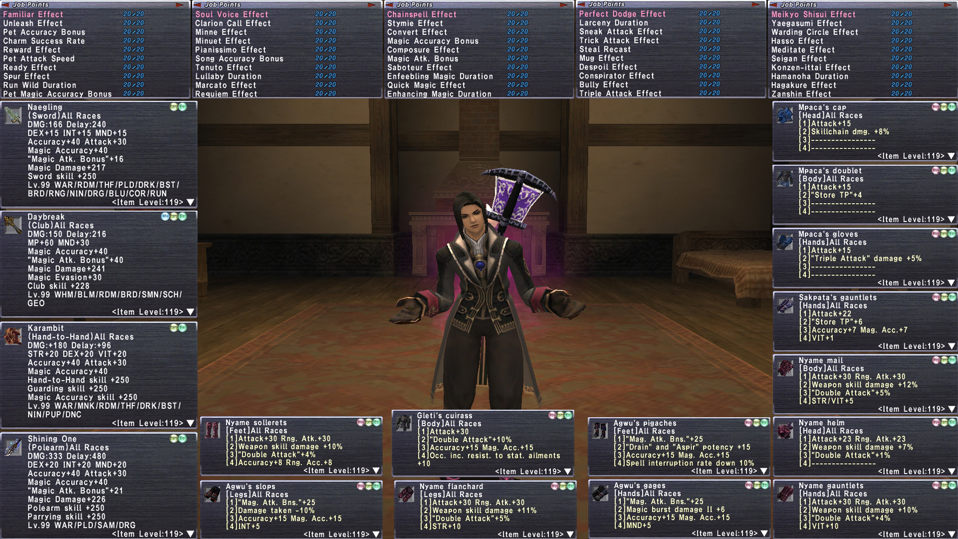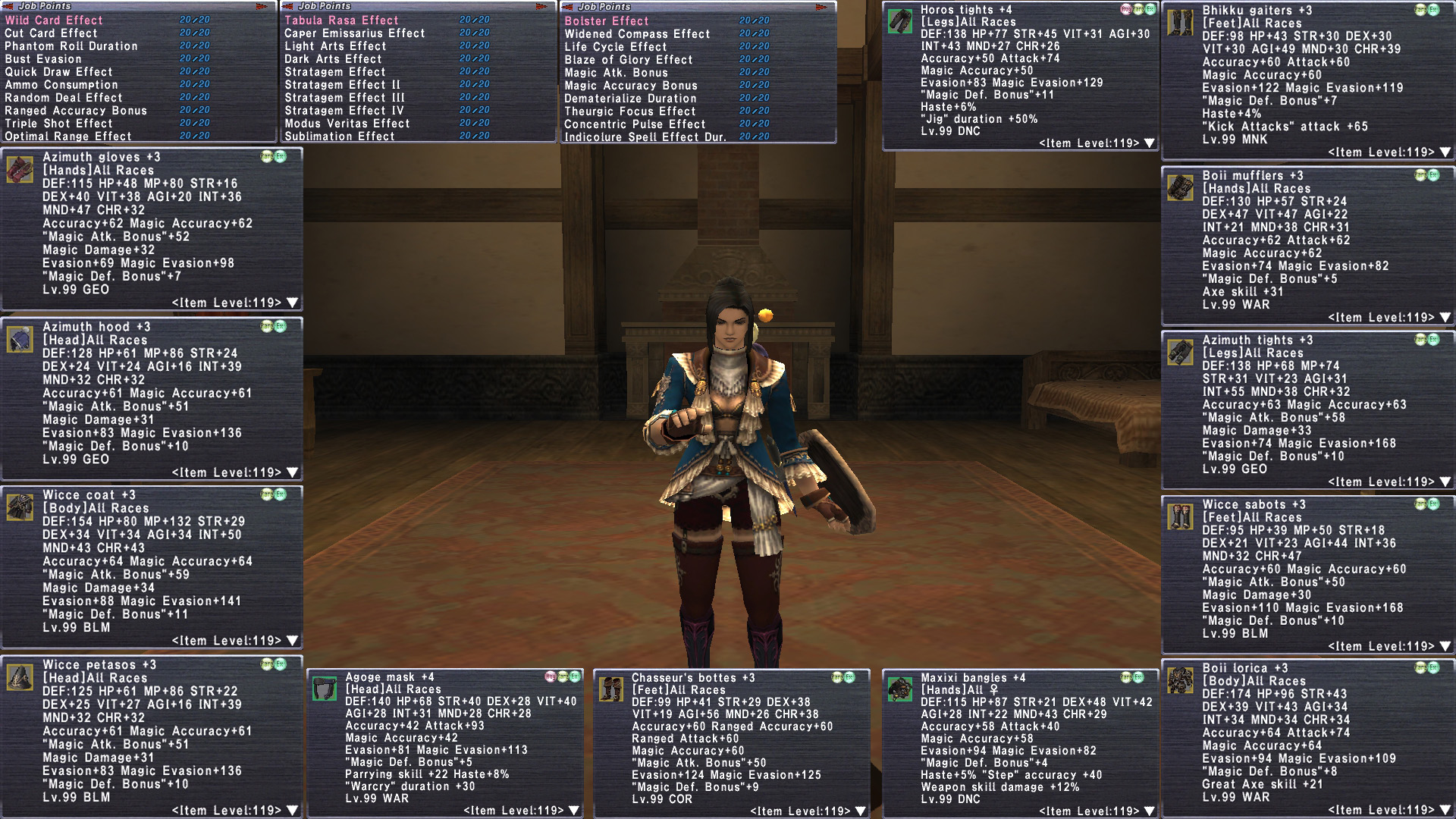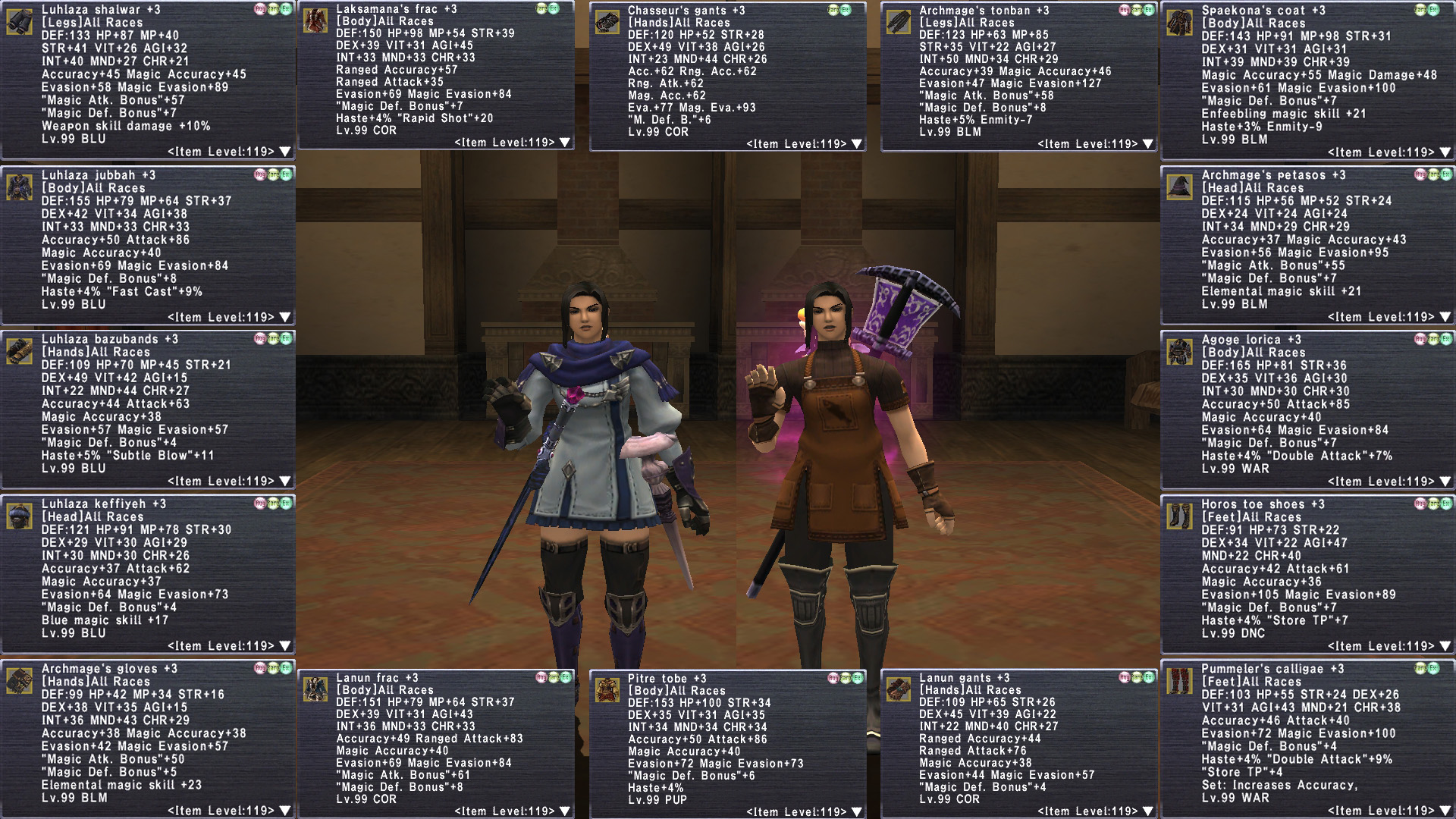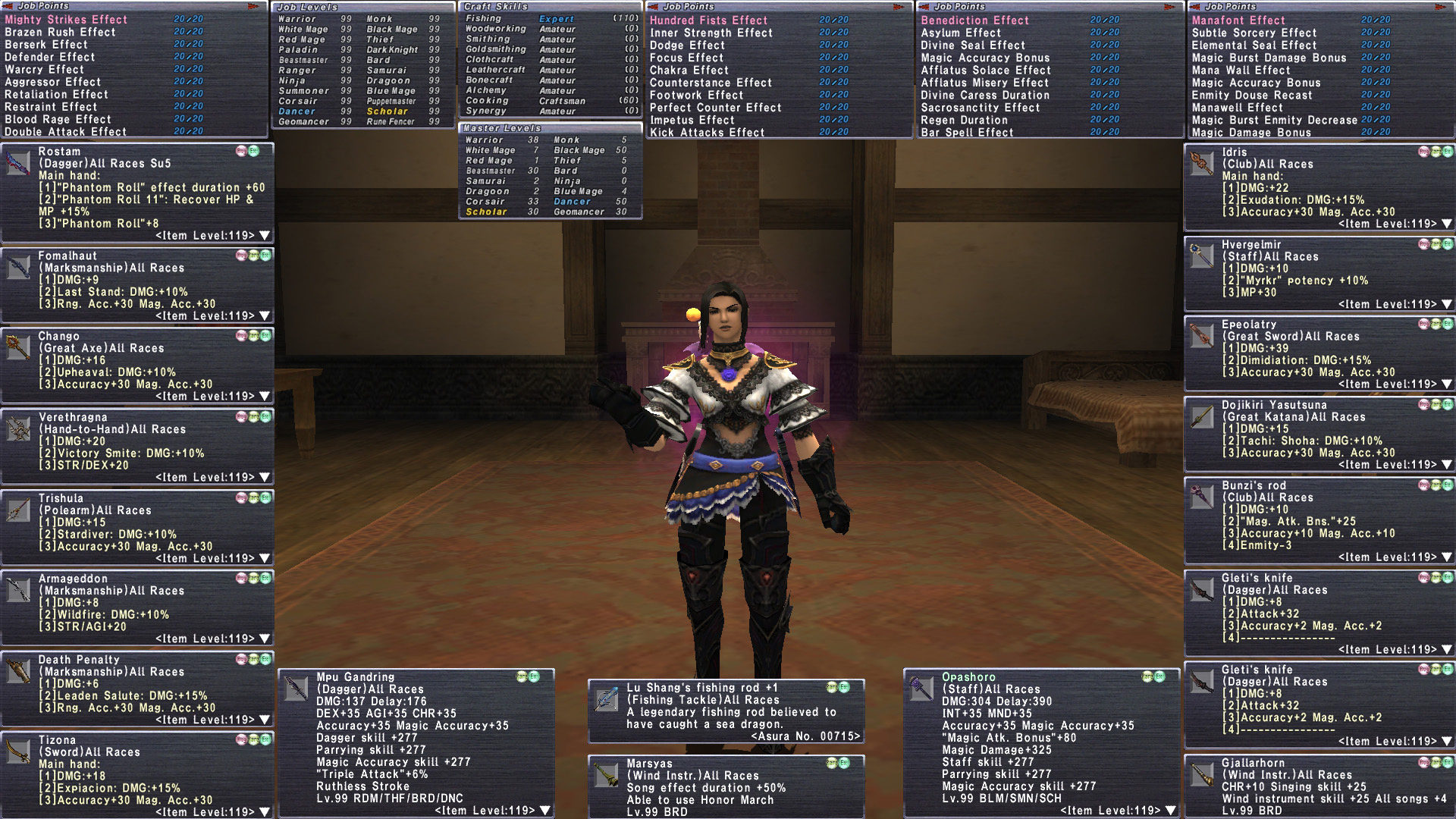 tldr Insane Double Prime account on Asura. Fully upgraded Stage 5 Staff and Dagger. ML50 DNC and BLM. Epeo/Idris 6/6 Legend, tons of reforged +3/4. 13 Sortie +2 earrings!! Full missions done. Stacked COR with DP/Armag/Fomal/Rostam. Tizona BLU, Yagrush WHM. Verethragna Monk, Doji SAM and more. Odyssey Atone1/2 V25 clears. 2 Atonement3 v25 clears. Nyame r25. 10x Su5+2 necks, 9x volte. Ashera Harness Omen/Rx. Tons of Ambus JSE capes. Unity+1@r15. TP Bonus Gun/Dagger/Sword. 5x C. Palug. Full Malignance. Full Null. 6x Crepuscular including Cloak/Knife . 110 Fisher with GP items Ebisu+1 and Lu Shang +1. 2.1m Muffins on hand with 4 Mesos. This account comes with a second POL ID that has a 22x99 Hume M with Stage 4 Alchemy shield. See picture above. This account is beyond veteran in every way. Gearswaps are available. Account is currently on ASURA!