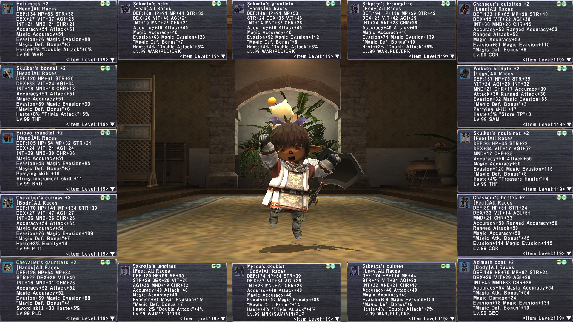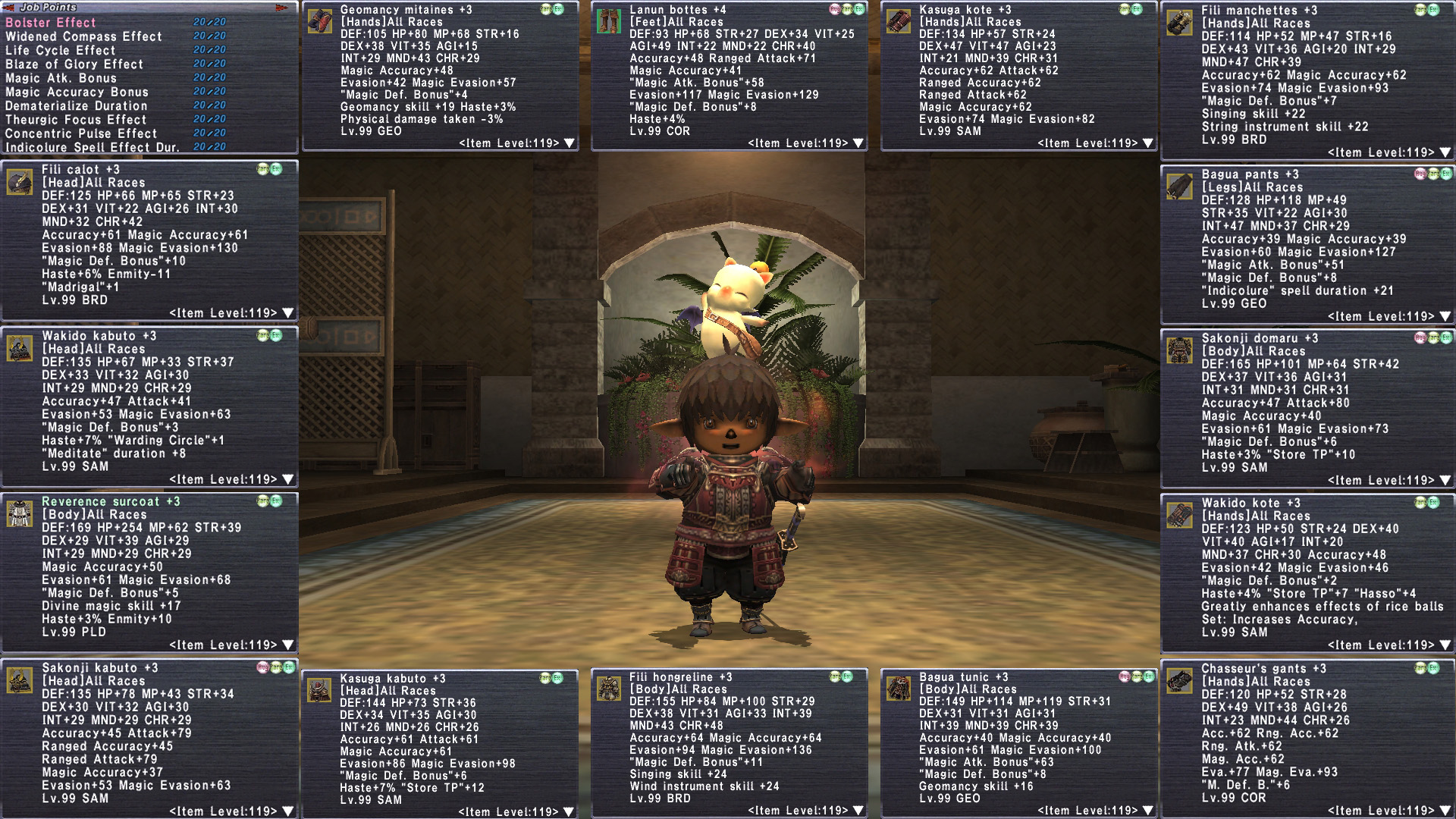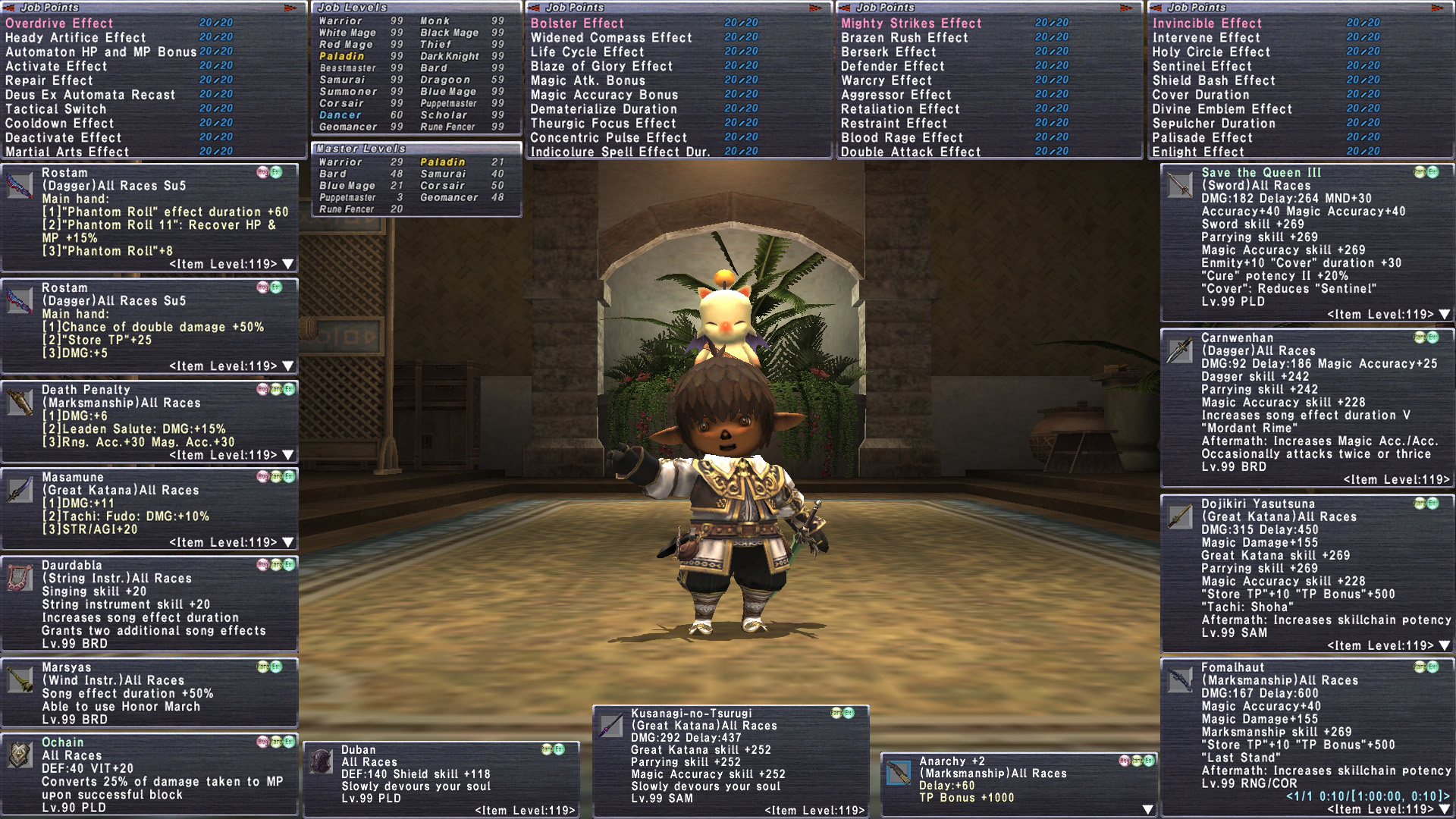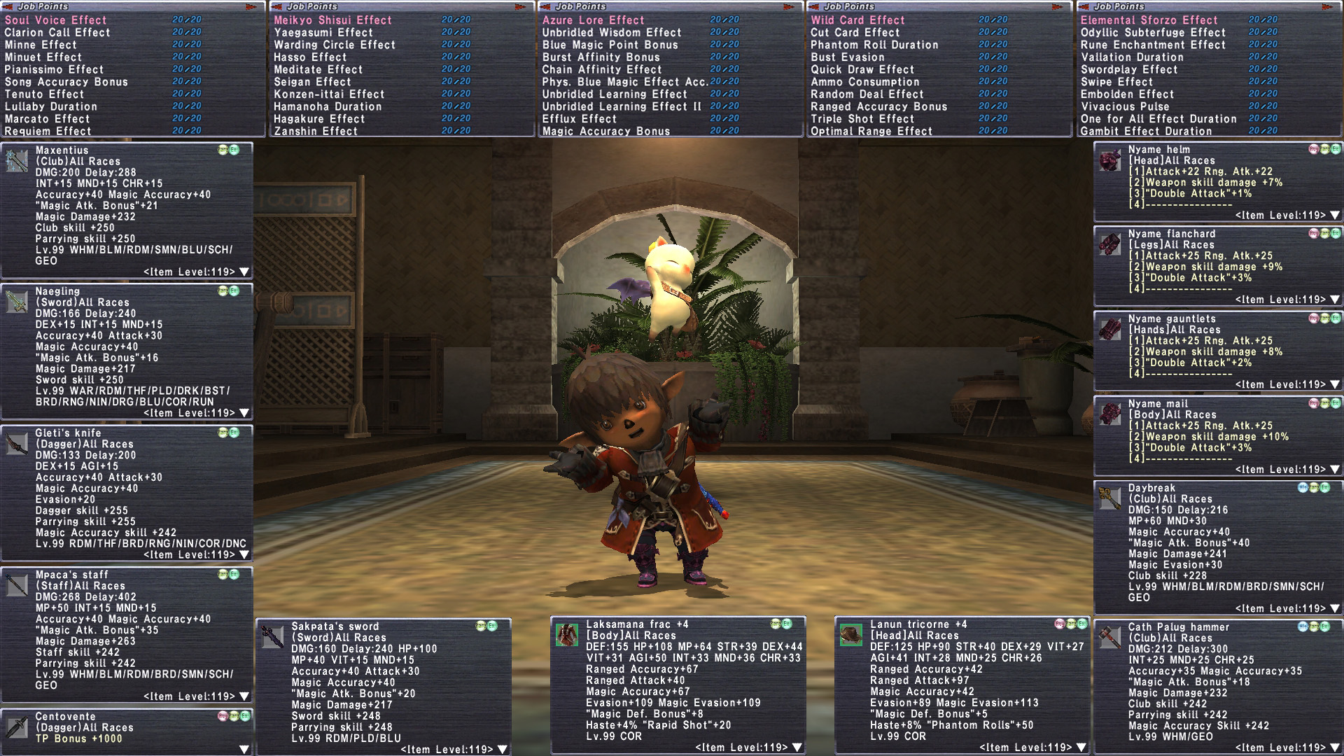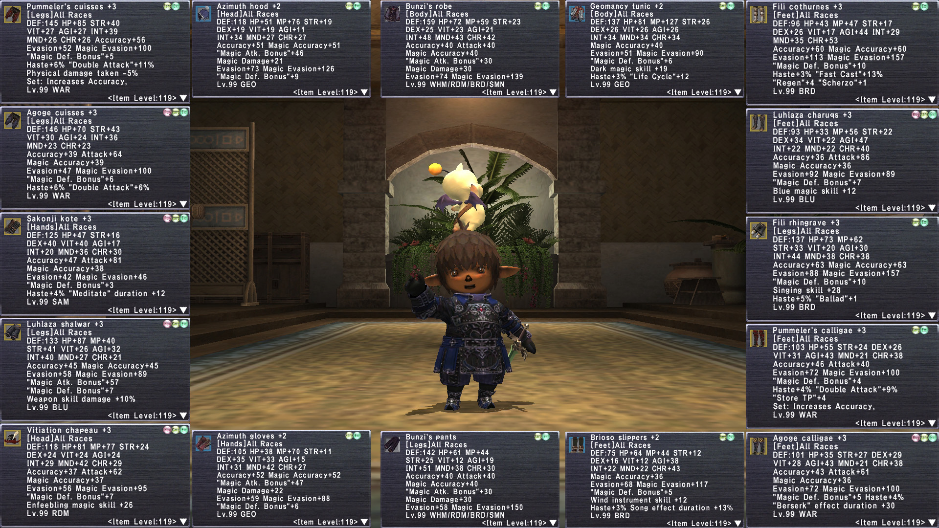 tldr Beast Taru with a FULL REMA Bard. Carn/Mars/DDB/Ghorn with Empy+3. Naeg/Tp bonus dagger/gun/sword. ML50 Corsair double rostam, deathP, Fomal, Limbus+4 empy+3. Doji/Masa SAM, Full Malignance. lots of Su5+2 necks done. Proper built Blue mage with spells. Nyame20. Nicely built Geo with reforged+3. Good Omen/RX with Shamash Robe. Domain Invasion items. Unity+1@r15. 3x Null. Lots of jobs ML25+