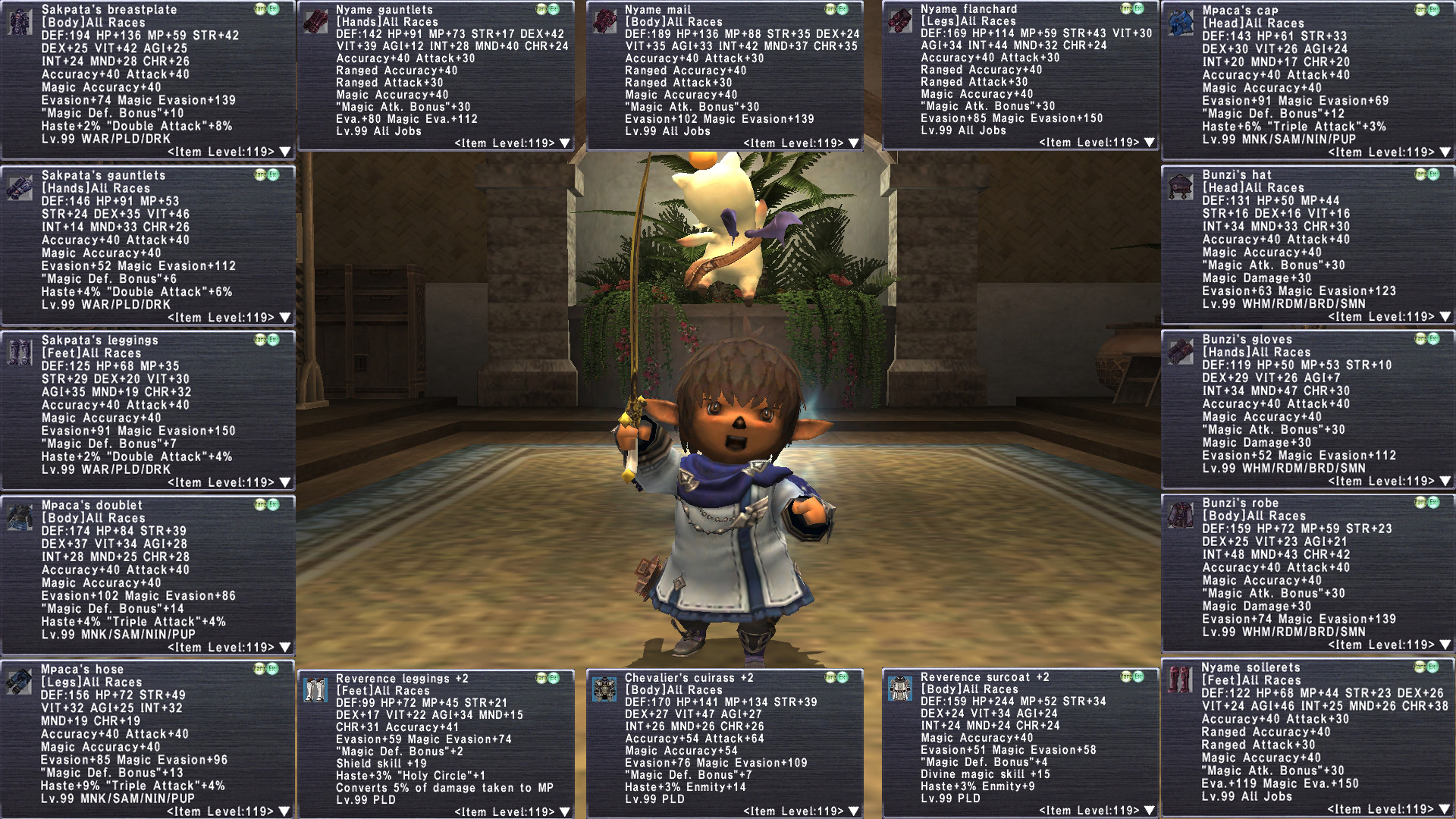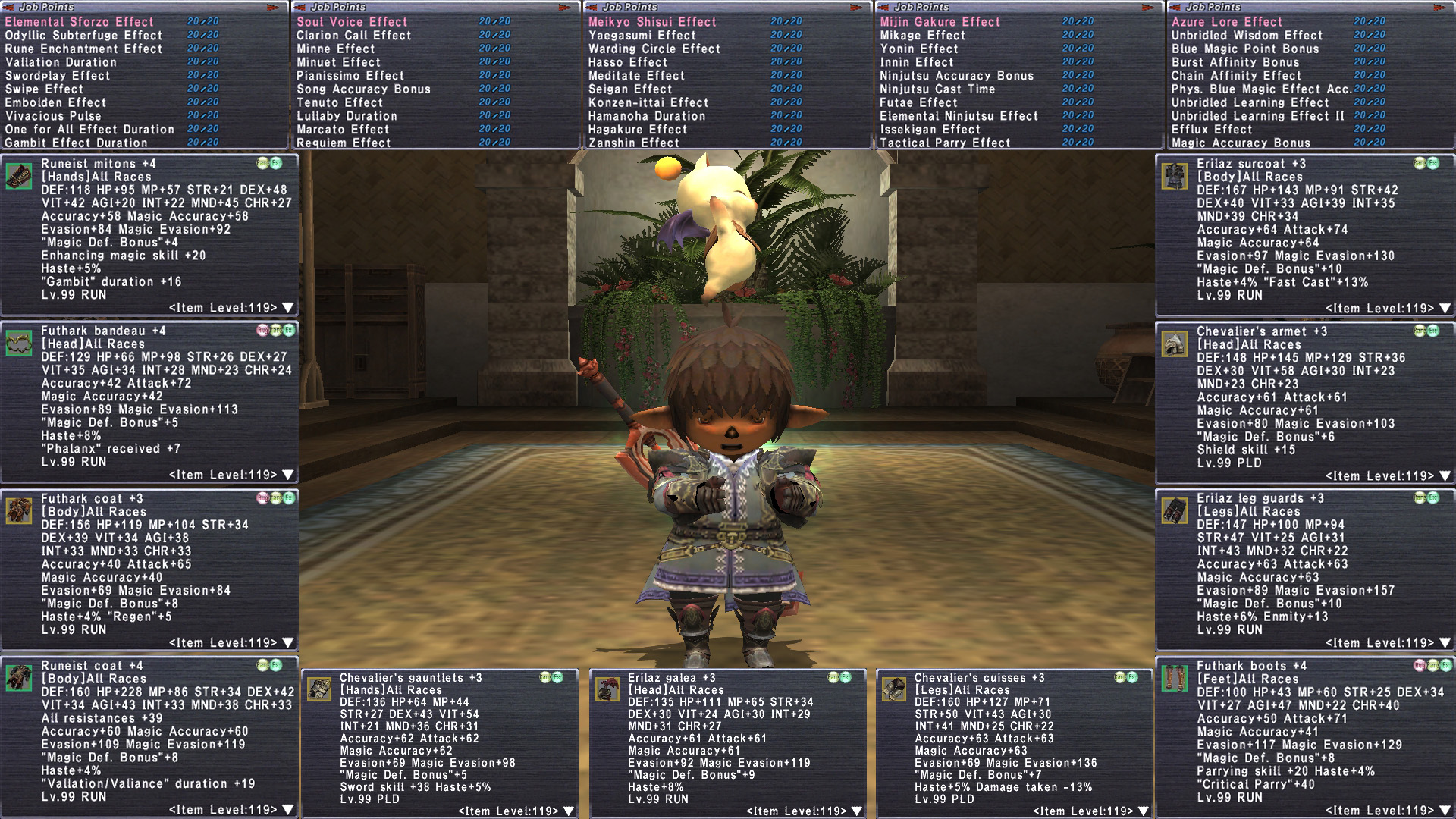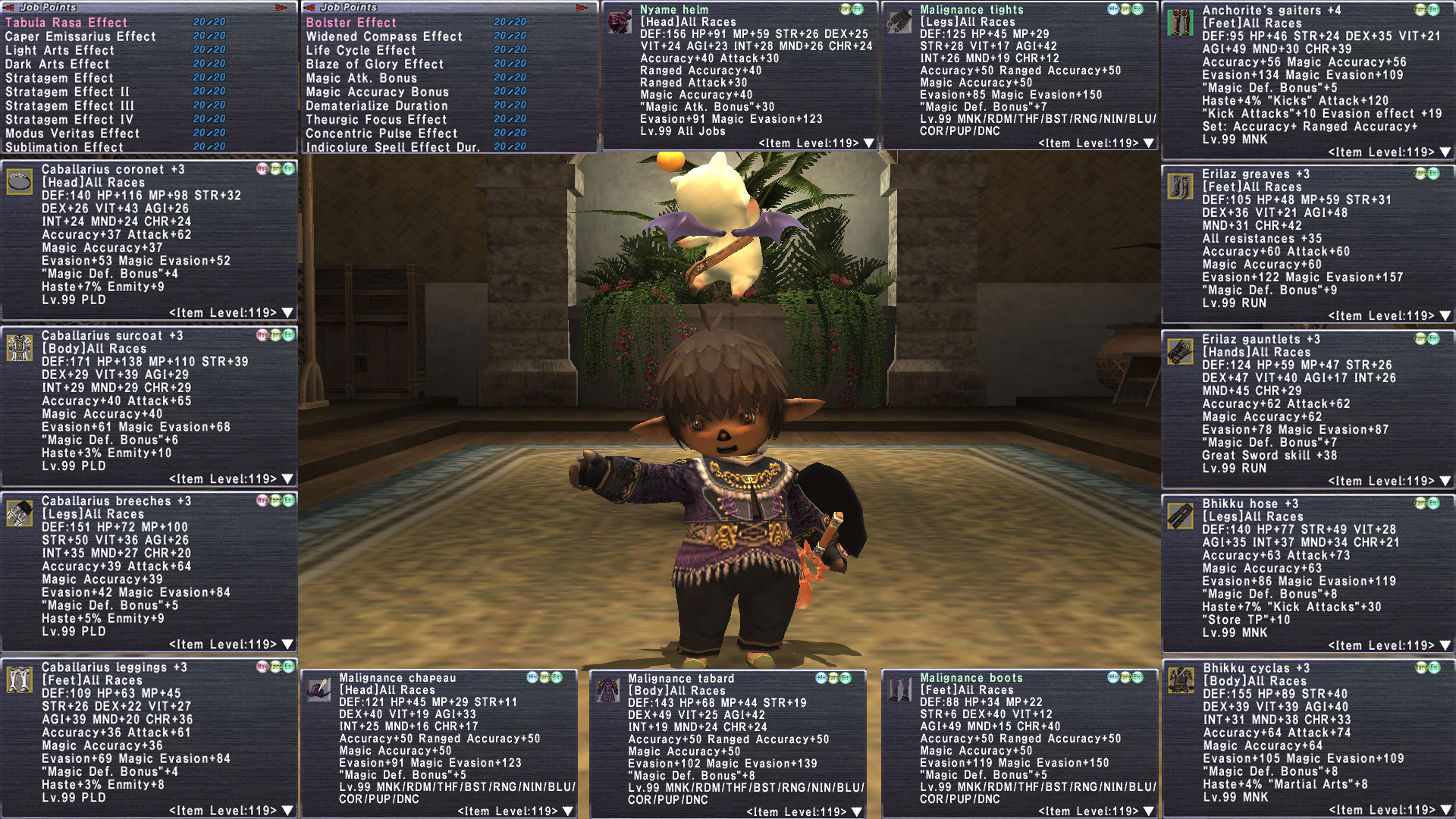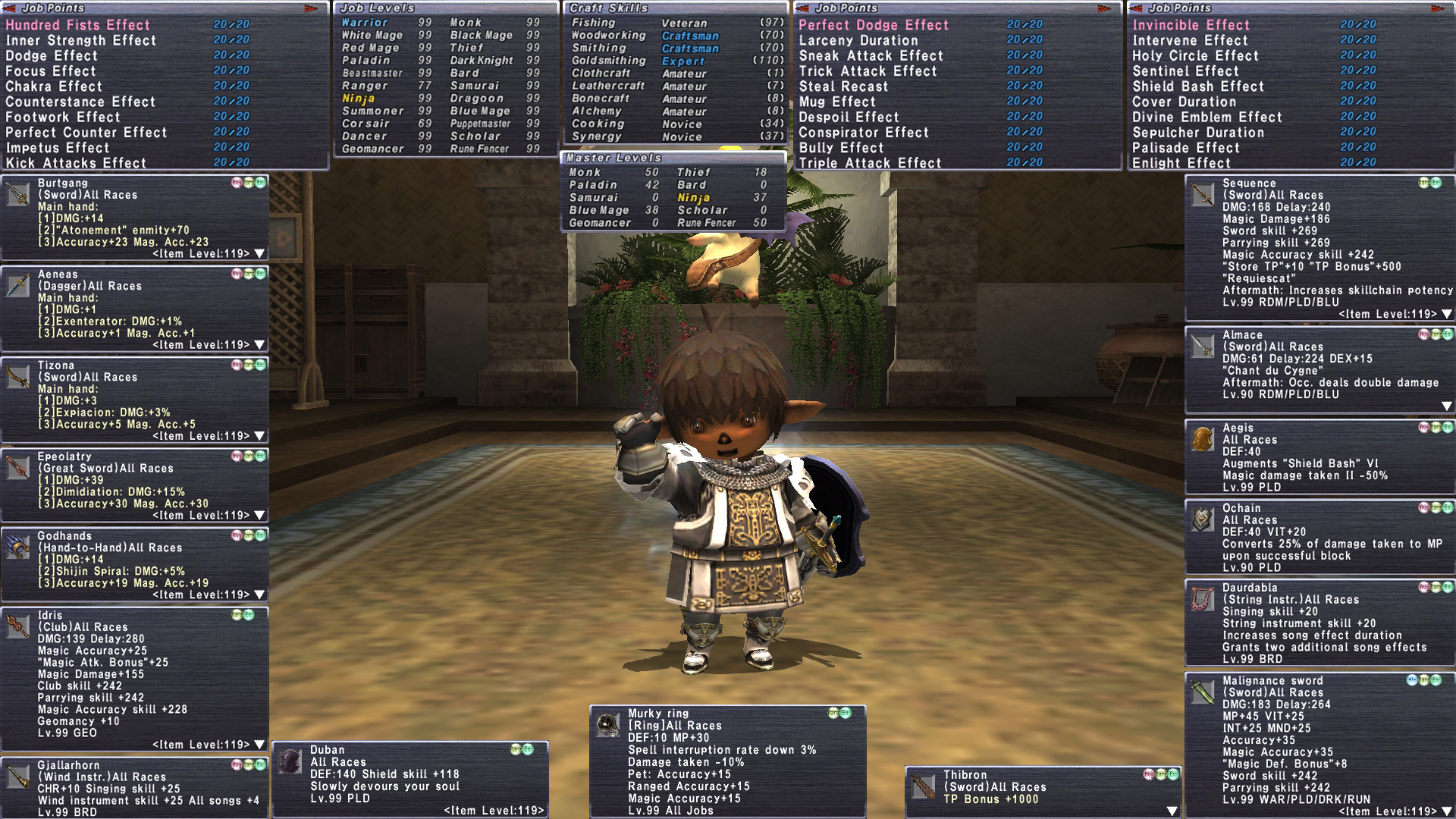 tldr Super built Taru. You can tell right away with a Mastery Rank of 7! Idris Geo. Epeo Run. Burtgang/Aegis/Ochain PLD. DDB/Ghorn 4 song Bard. Doji Sam. Tizona BLU, Godhand Monk and more. Murky ring/Alabaster Earring from Limbus. Empy+3 from Sortie. Reforged +3. Base Ody gear. Omen/Ambu. Decent TH/Phalanx DM Aug. Full malignance, 3x Null Fotia Belt/Gorget, Defending Ring. TP Bonus Sword. 97 Trusts. 110 expert Goldsmithing and Ebisu Fishing Rod. Super flexibility. Support/Tank/DD/Bard