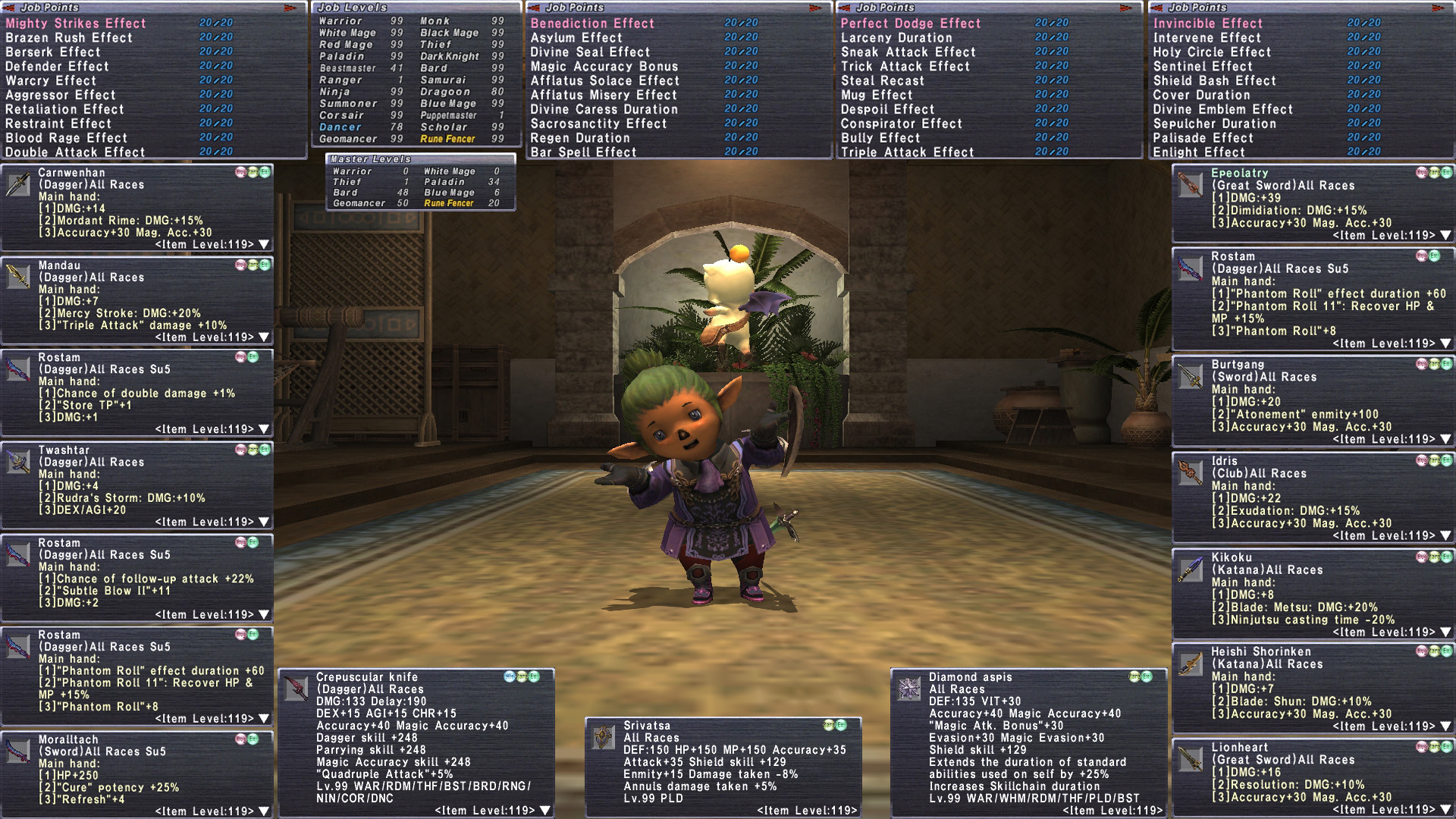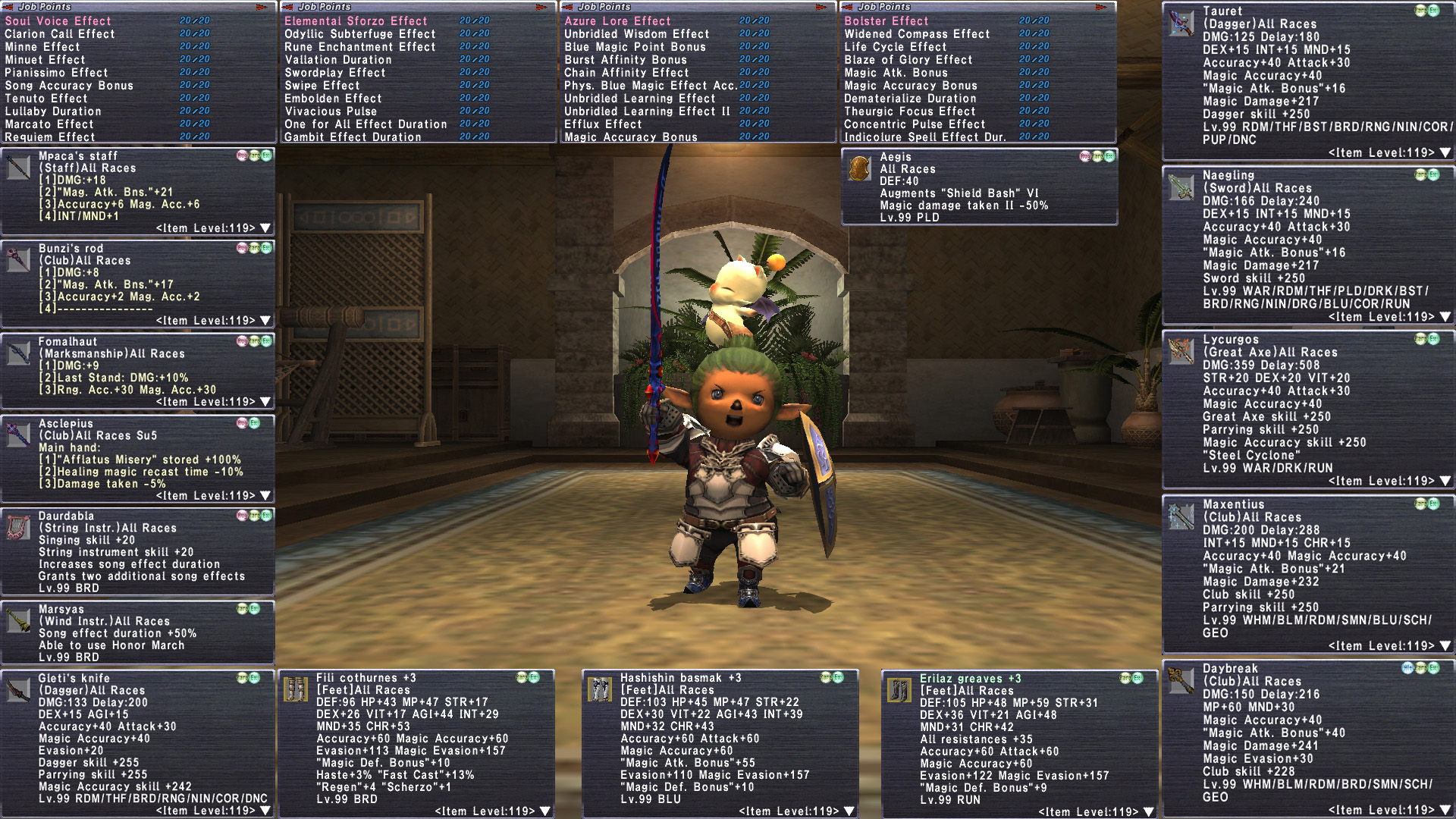 tldr Absoutel Beast Taru on Bahamut currently. Full REMA Bard. Idris Geo. Epeo/Lion Rune. Aegis/Burt/Srivatsa PLD Heishi/Kikou NIN, Chango WAR, Mandau/Twash THF. Good Limbus +4 reforged. tons of Empy+3, Relic+3, AF+3. DRK/NIN/BST/PLD/SCH+2 JSE Sortie Earring. Tons of Odyssey with MOST gear rank 25! Sakpata open to 30. 3x Rostam COR. 9x su5+2 necks. Asclepius/Gandring/Moralltach. Great Omen R/X including Regal. Ashera/Dagon/Shamash/Nisroch bodies. Strong 119+1 abjuration sets. lots of Ambuscade +2 and JSE capes. lotsa of Unity+1 R15. Crepsucular Knife/Cloak. Full Malignance. 3x Null. TP Bonus Dagger/Sword. 6/6 Legend. Mastery Rank 6. 90 Trusts. 147k Nyzle Token, 219k Mog Segment, 100k Gallimaufry. Lots of playtime properly built!