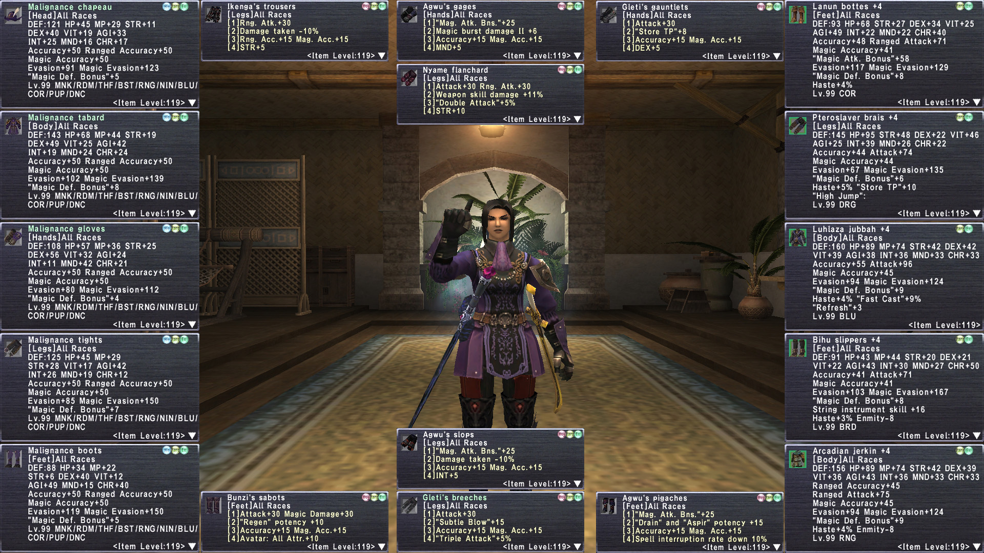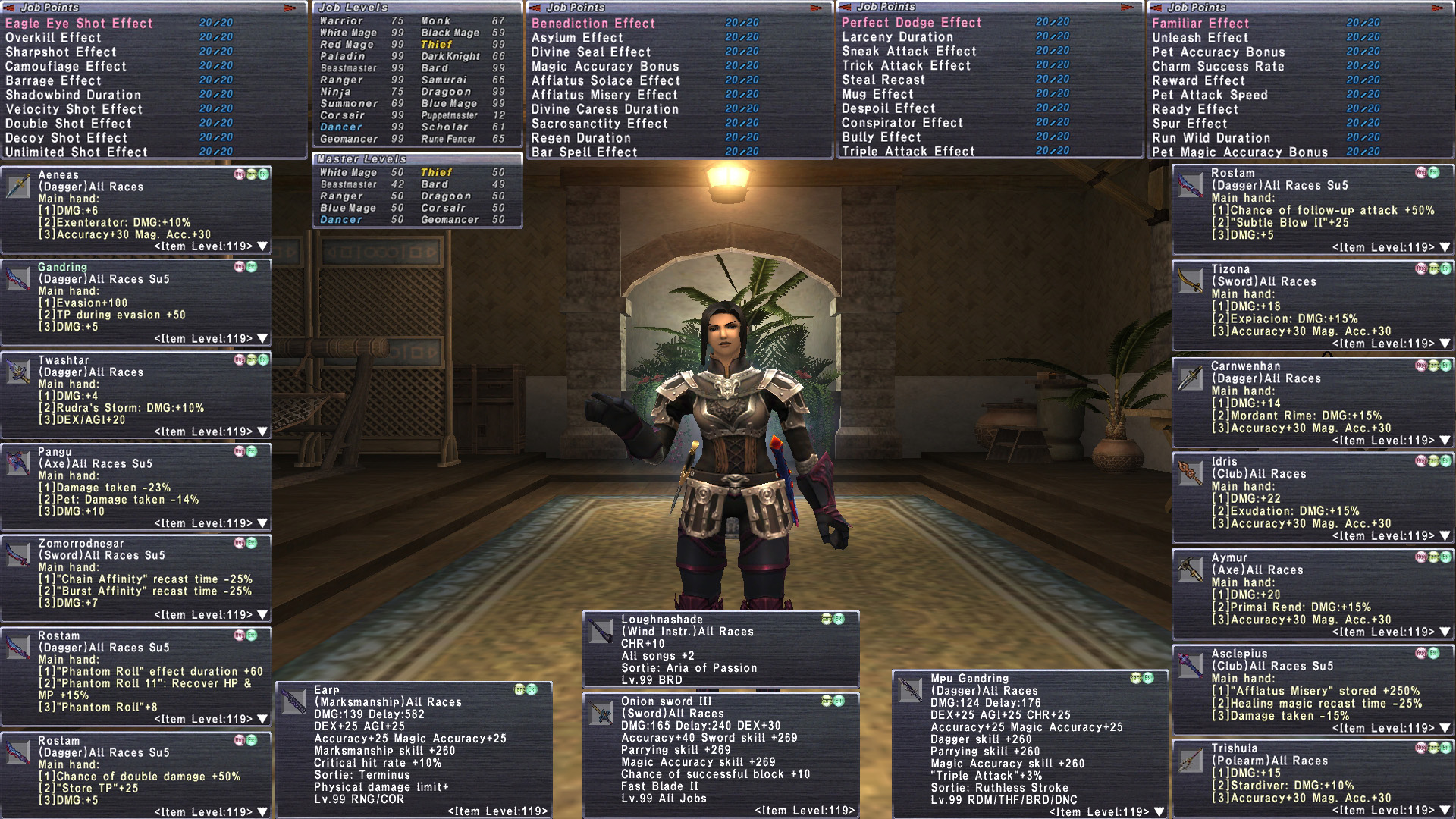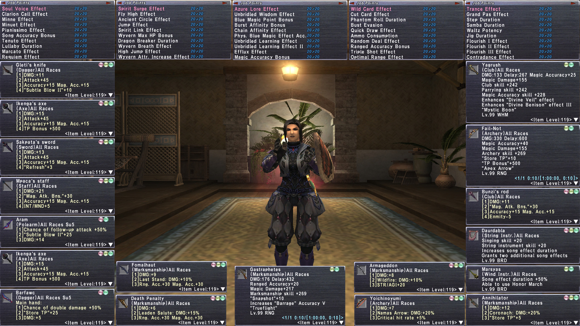 tldr Beastly Hume Female on ASURA. REMA Bard. Yagrush WHM. IDris GEO. Tizona BLU, Trish DRG, Mythic Beast. REMA COR and RNG. Its ALL here. Lots of Rank 30 Odyssey gear. 20 pieces of Limbus+4. Rank 30 alabaster earring, R25 Murky Ring. 10x su5+2 necks triple rostam, pangu/gandring/ascelpius/zomorrodngar su5 weapoins. Tons of sortie+3 Af/Relic+3 Mastery Rank 6. Heavy ML, lots of 50s. Full malig. Crep Knife/Cloak. 3x Null. (2) Stage 3 Prime's Horn/Gun. 4x TP bonus weapons. Ambu backs proper. Over 40 pieces of Unity+1@r15. Missions done including RoV and tVR.