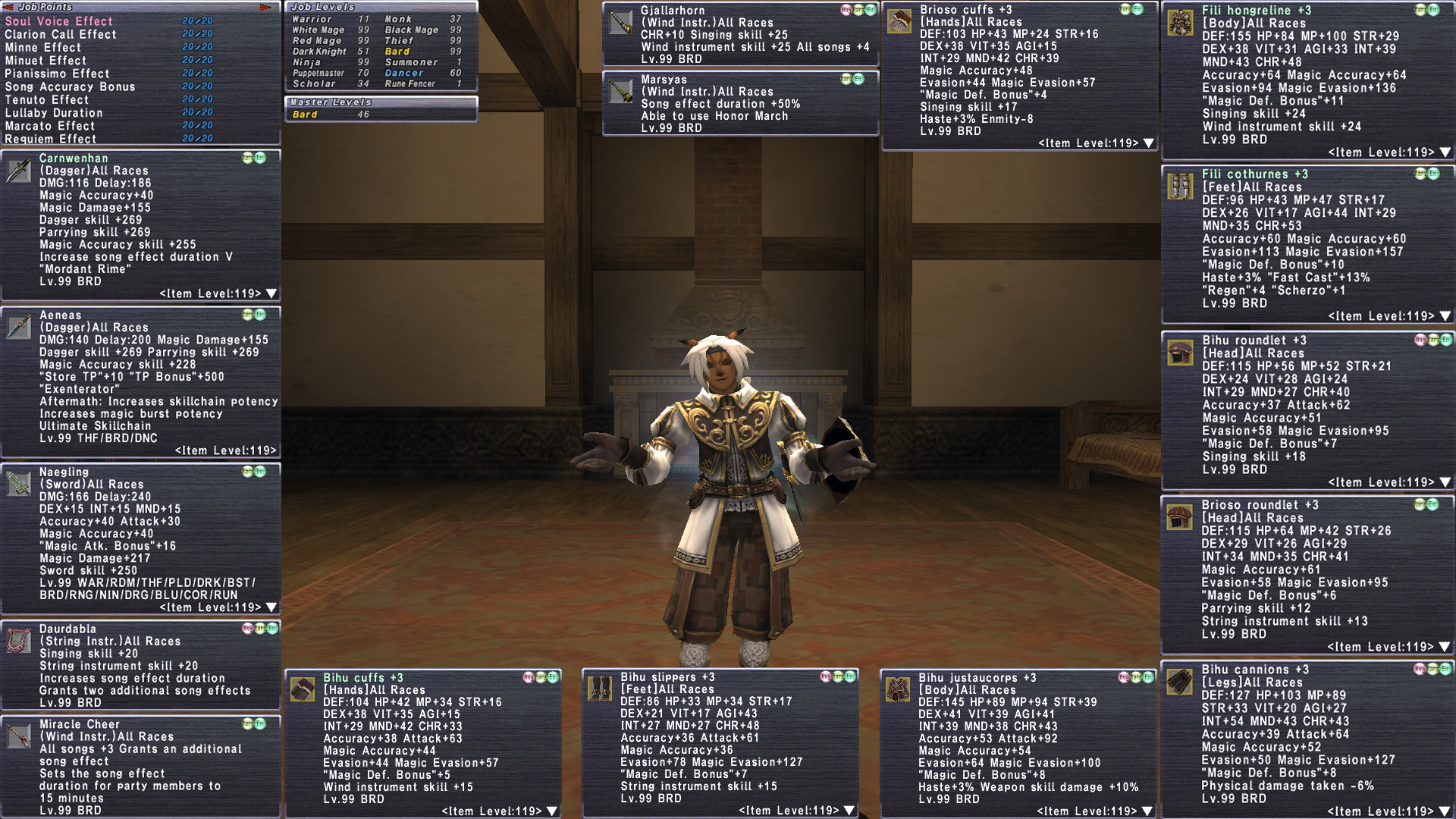 tldr Strong REMAA Bard with Ghorn/DDB/Carb/Marsyas/Aeneas. (Also Miracle Cheer)Missions done including RoV and TVR, Reofrged is mostly +3 with some +2. TPBonus dagger, Naegling. JSE capes. Unity+1@15. Good JSE backs done. Ichor for another Mythic tokens, approx halfway. GEO and RUN no progress but coalitions are DONE 6/6 Legend. 3x Malignance. ML46. Perfect purpose built Bard