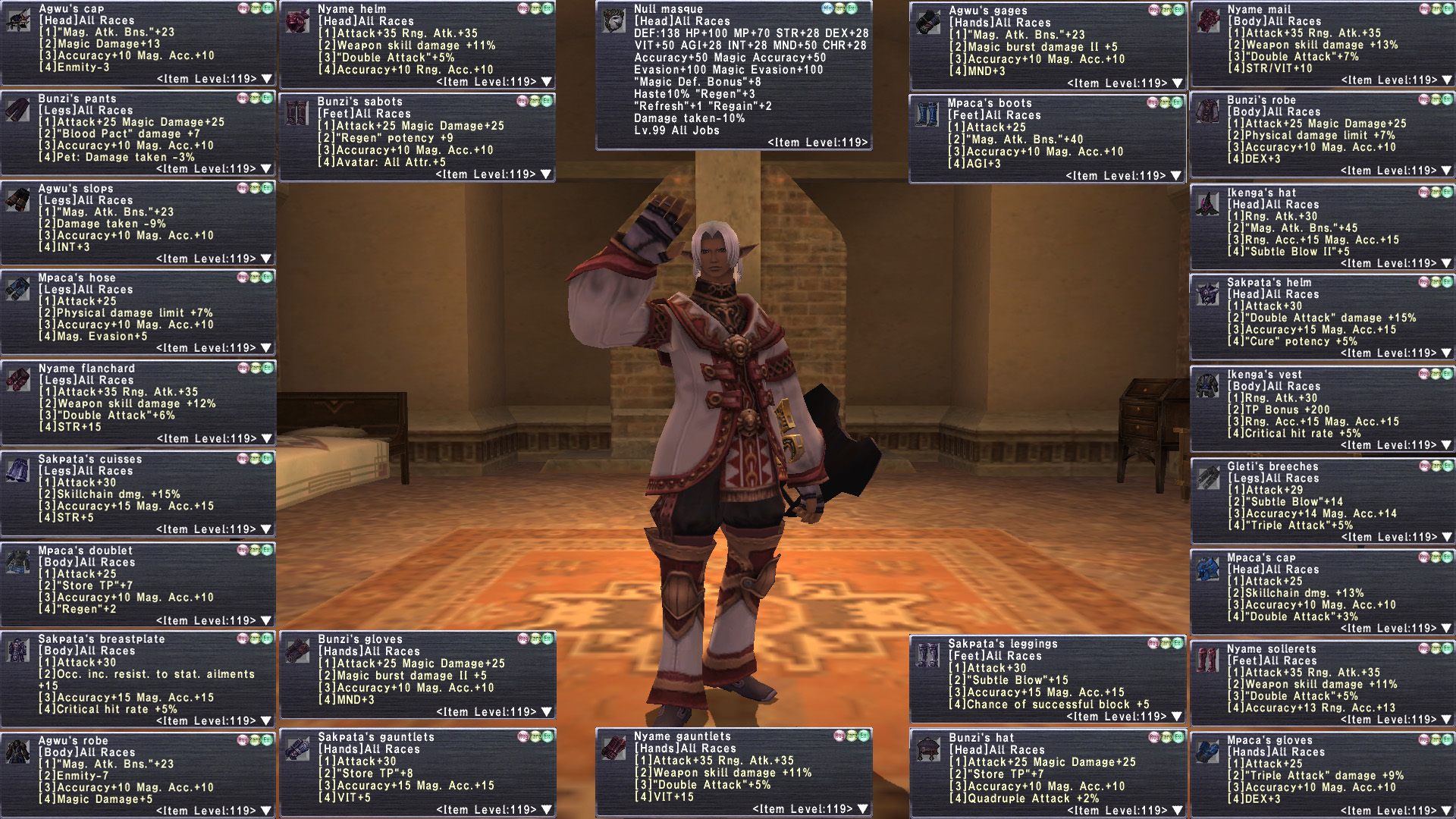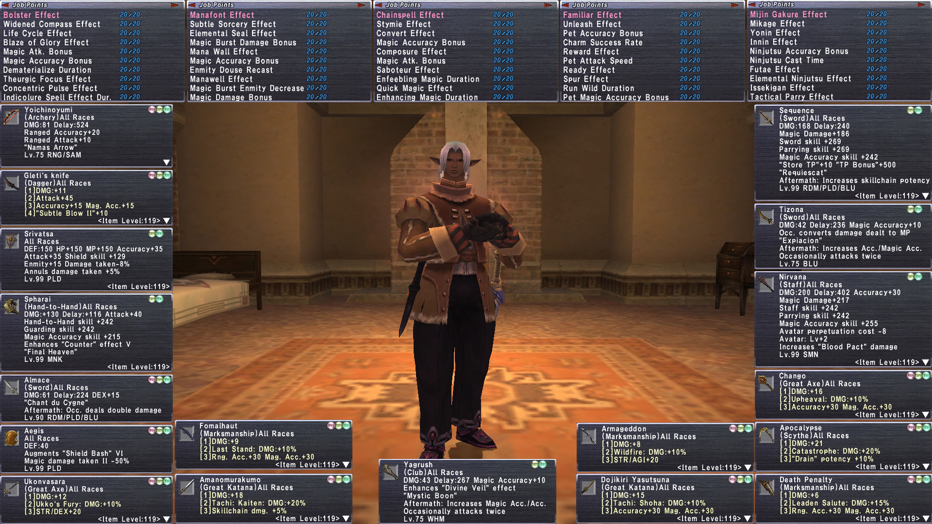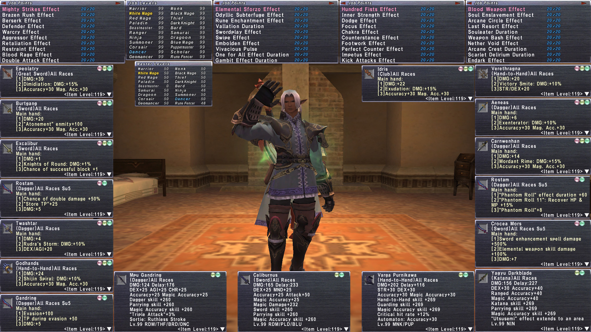 tldr This is about as BEAST MODE as it gets. Insanely decked out Elf M with 18 jobs geared at ELITE level. Full 6/6 Legend with Golden Shovel. Stage 4 Prime H2H Varga Purnikawa. 30 REMA most Rank15. Tons of reforged +3, limbus+4. Full Odyssey v25 clears. (can pop bumba v25). Full Nyame r30. 16 su5+2 necks. Crocea, Rostams,. Massive Omen, amd Ambu JSE. Domain Invasion. Unit+1@r15. C Palug, Full Malig, Full Null. Missions up to date. 100 Trusts, 15 jobs are ML50. Insane. gearswaps available
