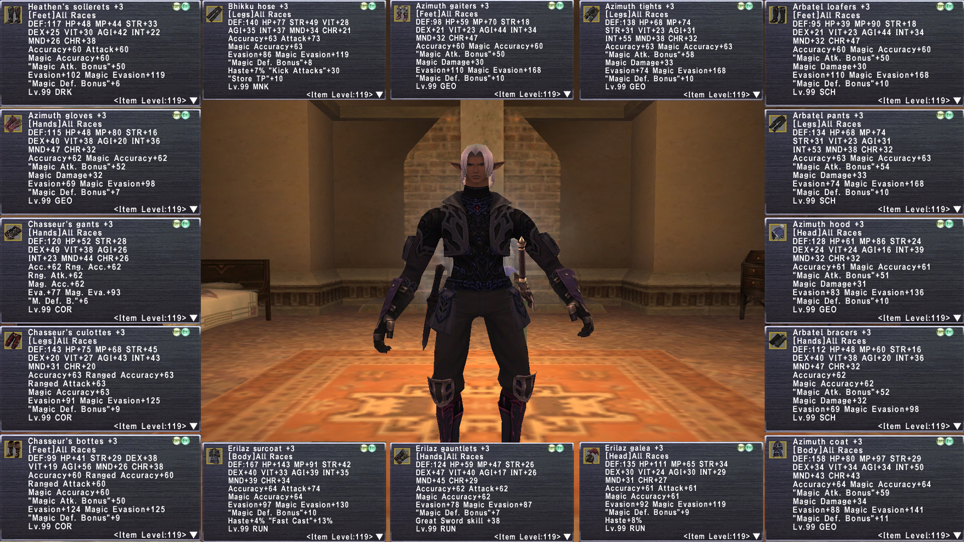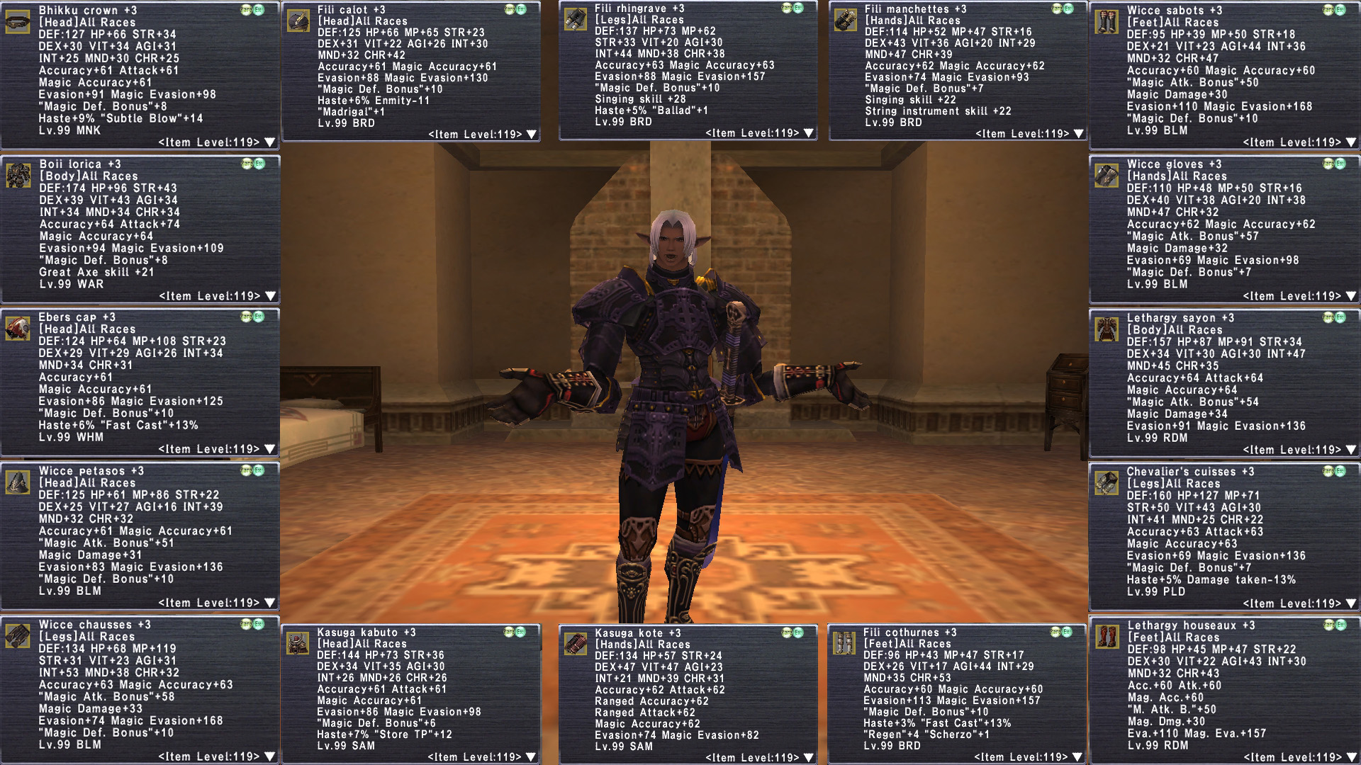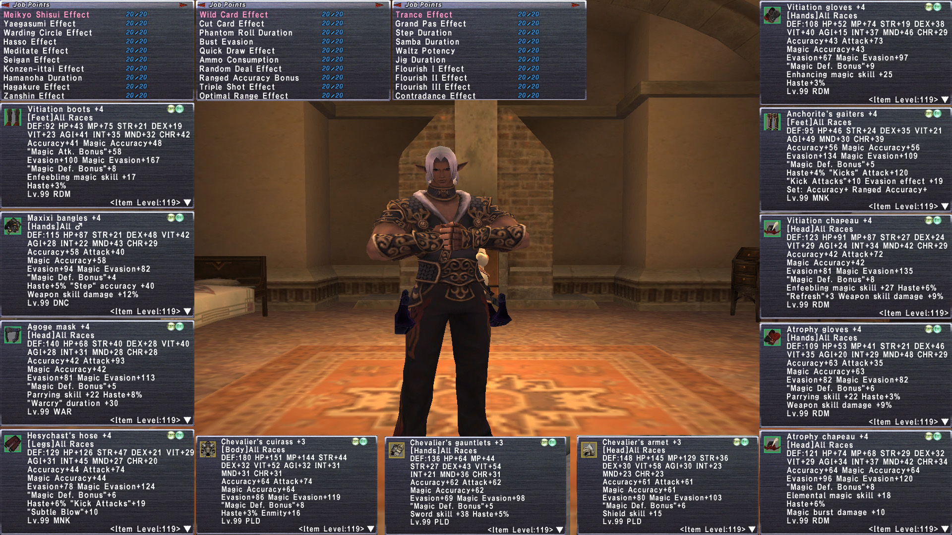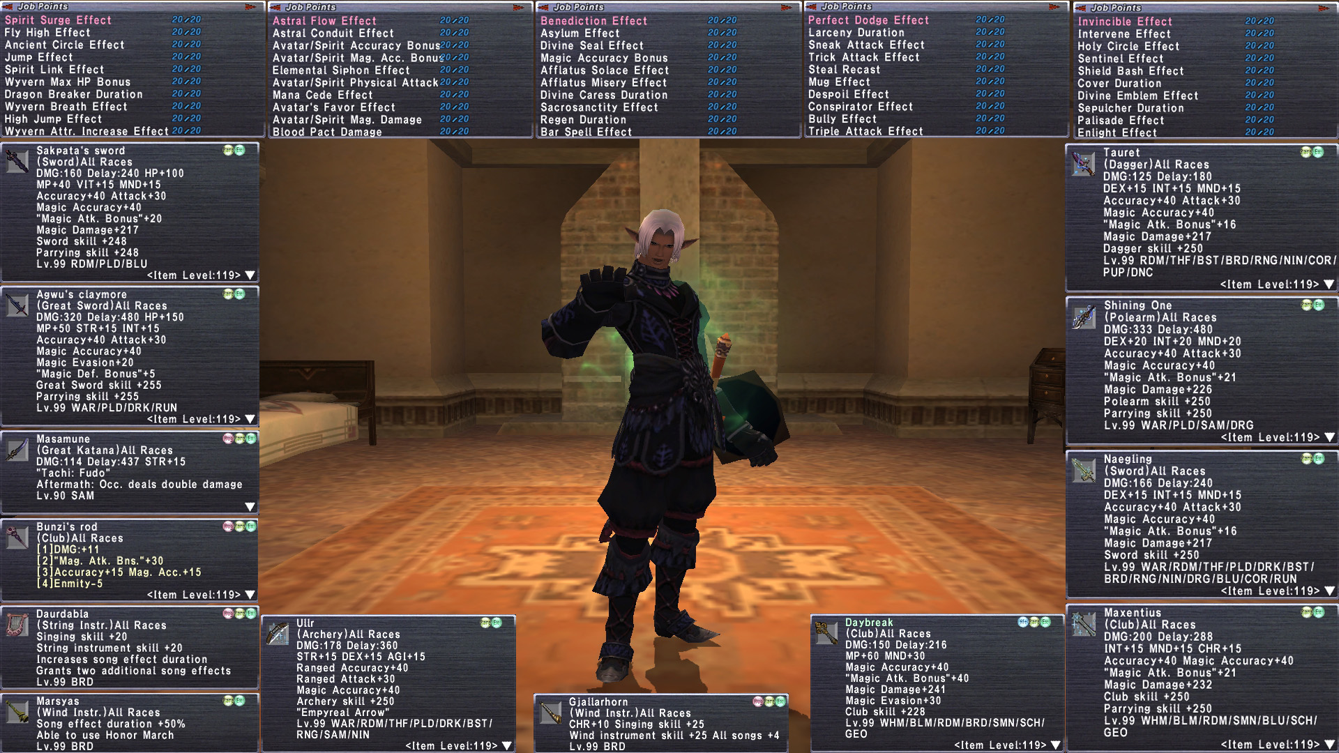 tldr This is about as BEAST MODE as it gets. Insanely decked out Elf M with 18 jobs geared at ELITE level. Full 6/6 Legend with Golden Shovel. Stage 4 Prime H2H Varga Purnikawa. 30 REMA most Rank15. Tons of reforged +3, limbus+4. Full Odyssey v25 clears. (can pop bumba v25). Full Nyame r30. 16 su5+2 necks. Crocea, Rostams,. Massive Omen, amd Ambu JSE. Domain Invasion. Unit+1@r15. C Palug, Full Malig, Full Null. Missions up to date. 100 Trusts, 15 jobs are ML50. Insane. gearswaps available